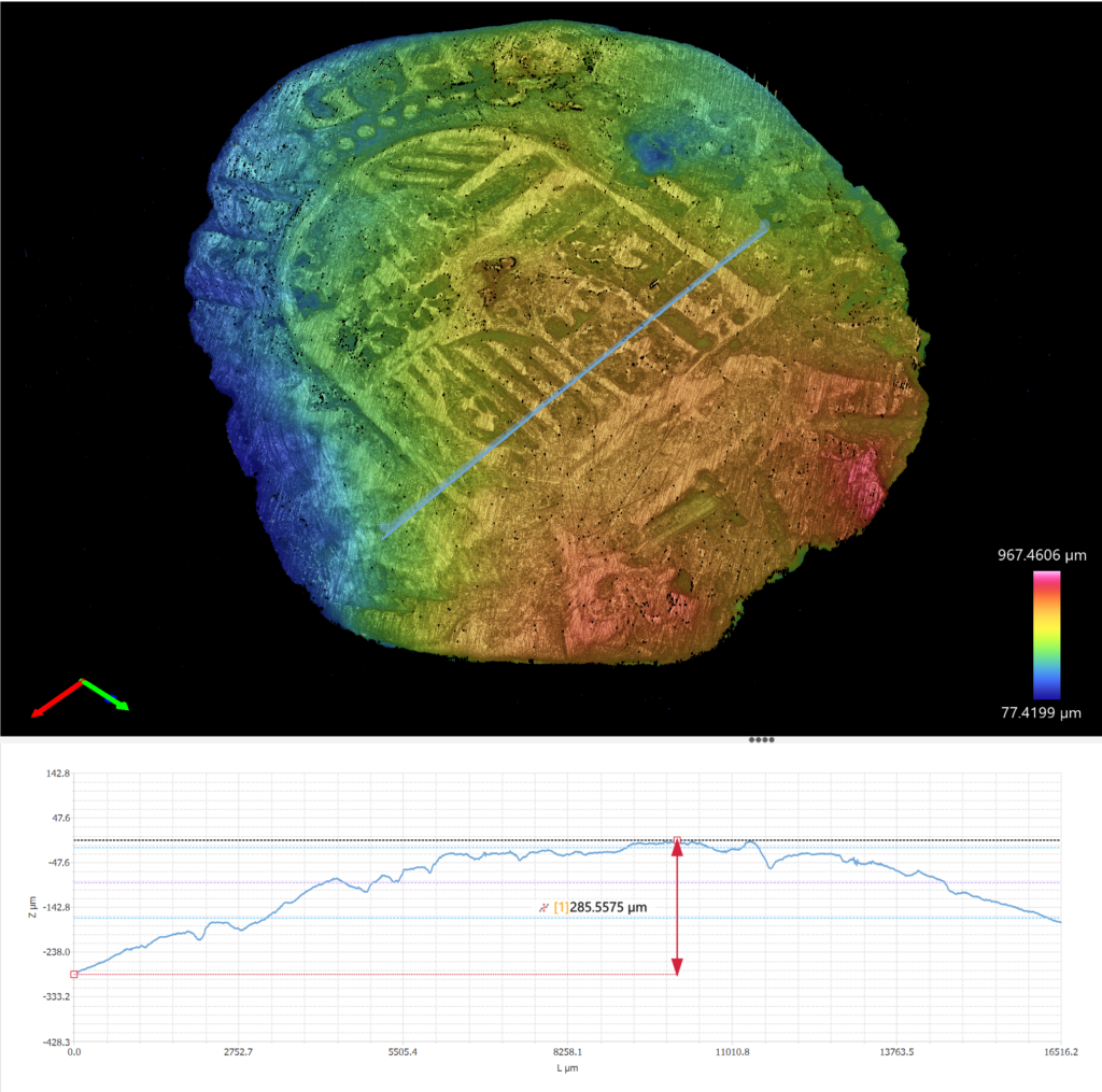 We then performed surface profiling using a profilometer. Unsurprisingly, the coin shows relatively low surface relief (Fig 4). Four centuries of handling and circulation have flattened most of the original struck features. The profile shows a generally flat central region with a gentle overall curvature—likely a combination of original hammering and long-term mechanical wear.