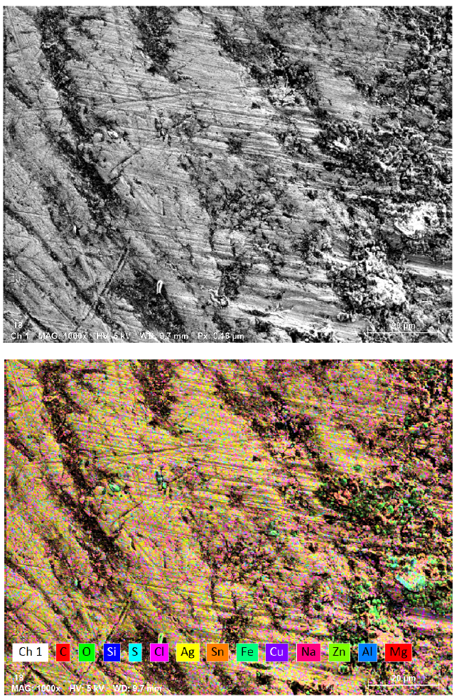 We also detected elements associated with corrosion and environmental exposure. Because the coin was not cleaned, the surface chemistry reflects centuries of storage, handling, and oxidation. From a materials perspective, this layered surface—metal, alloy phases, corrosion products—is far more interesting than a polished artifact.