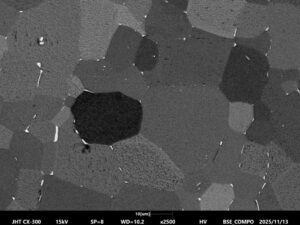 Figure 3 shows the surface after vibratory polishing using colloidal silica with hydrogen peroxide. Grain interiors are smooth and largely free of scratches, and grain boundaries are clearly defined in both SE and BSE images.